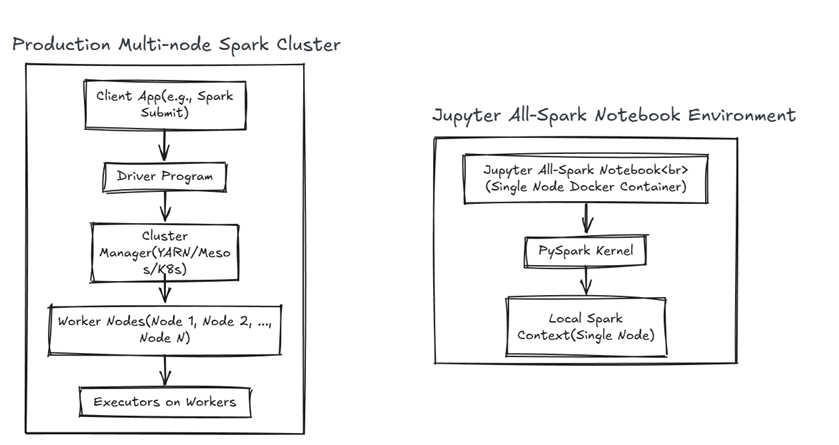 Jupyter All-Spark (This Guide) runs Spark in standalone mode on a single machine: - Driver and executors run in one container - All processing uses local machine resources (RAM, CPU) - No network communication between nodes - Perfect for learning and prototyping