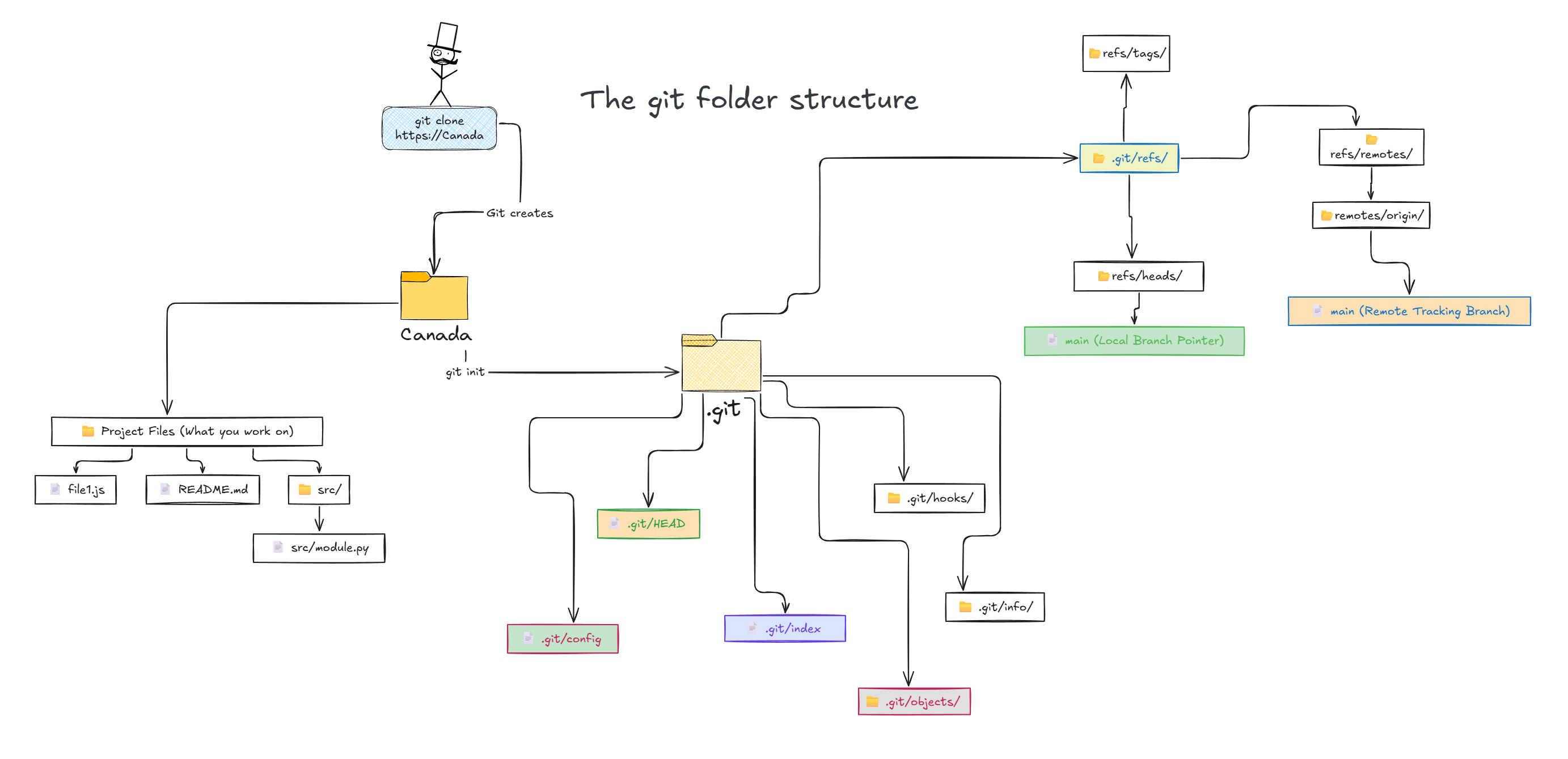 Git creates a folder and initializes a hidden .git folder inside it. This .git folder is the brain—it contains everything Git knows about your project.