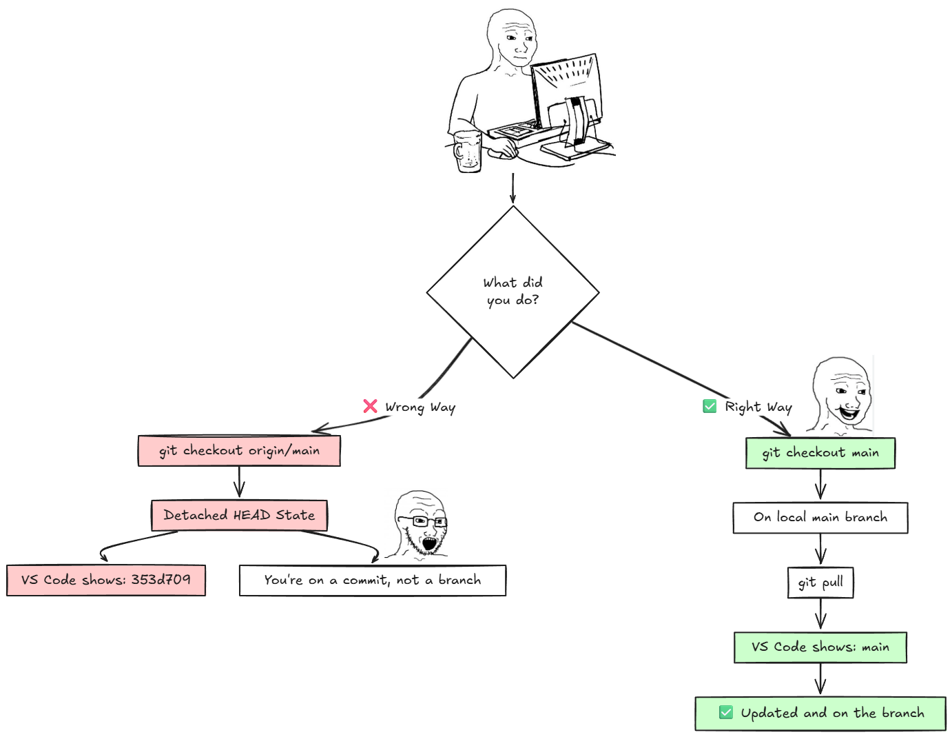 You run git checkout origin/main expecting VS Code to show "main" at the bottom left, but instead it shows something like 353d709. What's going on?