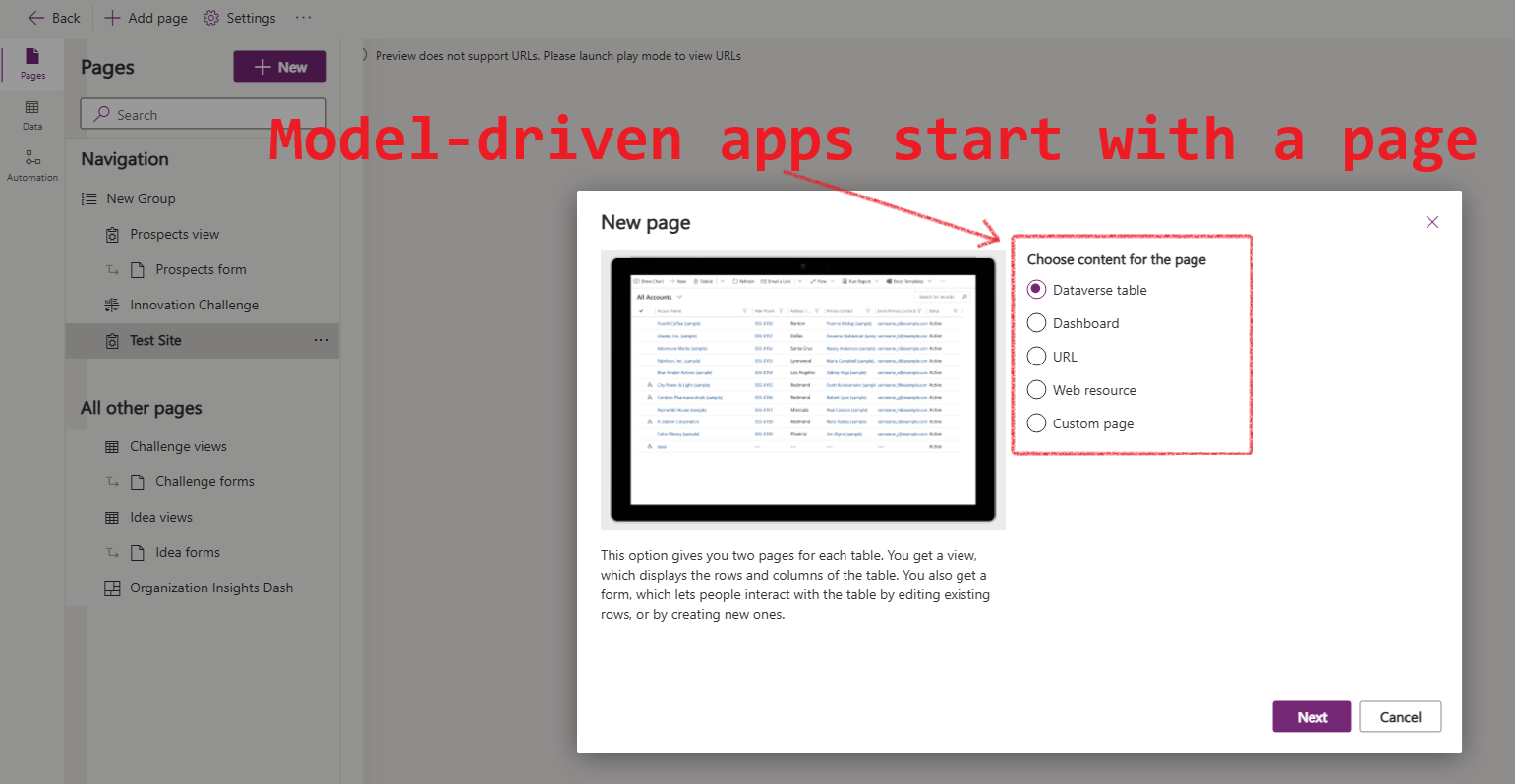 Different types of pages are Dataverse table, Dashboard, URL, Web resource, and Custom