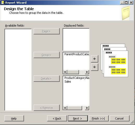 The Design Table step of the Report Wizard allows us to layout the available fields on our report, choosing between Page, Group, and Details.