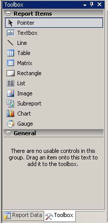 - Toolbox: Contains the Report Items that you drag and drop onto the design surface, such as Table, Matrix, Rectangle, List, etc.